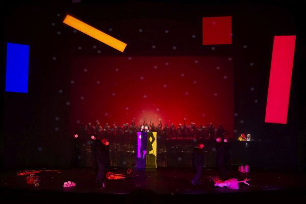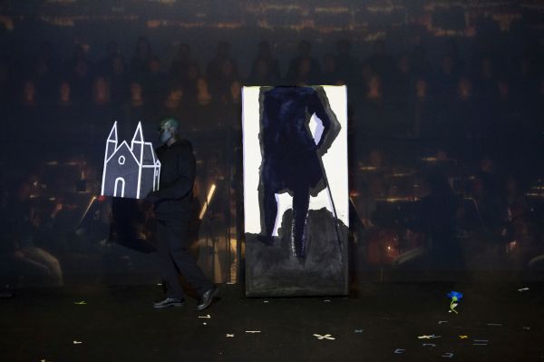 Achim Freyer hat in seiner Inszenierung gar nicht erst den Versuch unternommen, sich dem Faust über eine Dramatisierung zu nähern. Stattdessen bebildert er die von Schumann ausgewählten Textteile mit aussagekräftiger Symbolik. Dunkle Gestalten schleichen während der gesamten Aufführung in Zeitlupe über die Bühne und tragen die verschiedensten Gegenstände umher: eine Miniaturkirche, ein Kreuz, einen Totenkopf, eine Schubkarre, einen Spaten, geometrische Formen und vieles andere. Und auch die blaue Blume der Romantik fehlt nicht. Denn Schumanns Sicht auf den Faust entspringt ganz dem Geist der Romantik. Das unterstreicht auch die Stilisierung des Bildes „Wanderer über dem Nebelmeer“ von Caspar David Friedrich. Diese Wandererfigur hat keinen Kopf. Sie bekommt ihn erst dadurch, dass Faust sich dahinterstellt und er sich sozusagen mit ihr identifiziert. Beim Tode Fausts fällt die Figur in sich zusammen und taucht, dann ganz in Weiß, erst wieder bei Fausts Erlösung auf. Projektionen von bedrohlichen Wolken, von bunten Quadraten oder von strahlenförmigen Sonnenstrahlen ergänzen die Szenen. Doch insgesamt herrscht eher eine düstere Endzeitstimmung vor. Freyer zeigt vor allem die dunkle Seite der Romantik. Dabei macht er es zum Zuschauer nicht leicht. Man muss den „Faust“ schon gut kennen, um alle Chiffren zu entziffern. Und auf Dauer ist dieses Spiel mit Symbolen auch etwas ermüdend. Aber die Inszenierung ist ein typischer, unverwechselbarer Freyer. Bühnenbild, Kostüme und Lichtkonzept stammen auch von ihm. Er arbeitet hier mit ähnlichen Stilmitteln wie bei seinem „Parsifal“ vor einem Jahr.