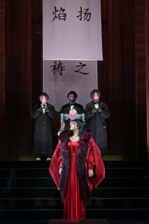 Liù stellt also das Zartgefühl der Reinheit dar, Calaf ist von Begierde, von Eroberungs- und Wollust getrieben und Turandot verteidigt ihre feminine und sexuelle Selbstbestimmung mit unerbittlicher Grausamkeit. Das gigantische Bühnenbild von Christian Schmidt mit der angedeuteten Art-déco Architektur und die faschistische Elemente verwendenden Kostümen von Falk Bauer evozieren ein bedrückendes Klima der Angst und der Gewalt. Die grotesken Figuren der drei Minister Ping, Pang und Pong mit ihren wie Gruselclowns geschminkten Gesichtern und die gespenstischen Bewegungen des Chores verstärken das gruselige, parabelhafte Geschehen noch zusätzlich. Yona Kim hat auch in der szenischen Gestaltung der Auftritte herausragende Arbeit geleistet, hat Vorder-, Mittel- und Hinterbühne konsequent genutzt und so das Auge wirkungsvoll auf das Wesentliche gelenkt. Überraschenderweise haben sie und der Dirigent Giacomo Sagripanti die musikalische Zäsur, welche nach dem Tod Liùs entsteht, nicht überspielt. Liù wird aufgebahrt, mit weißen Chrysanthemen bedeckt, zugleich werden Fotografien von Puccinis Leichnam projiziert und es folgt eine Generalpause, bevor das Alfano-Finale einsetzt.