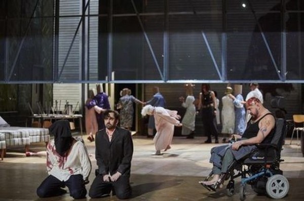 Warlikowski ist nicht das Geringste anzulasten. Hier haben wir es mit einem Regisseur zu tun, der sein Handwerk versteht. Seine Personenführung ist ausgefeilt, spannend und abwechslungsreich. Die zwischenmenschlichen Beziehungen werden von ihm einfühlsam aufgezeigt. Auf Tschechow’sche Elemente versteht er sich ebenfalls trefflich. Häufig sind Personen auf der Bühne, für die Gluck an dieser Stelle überhaupt keinen Auftritt vorgesehen hat. Wenn er im vierten Akt den Zuschauerraum in seine Interpretation mit einbezieht und einige Szenen im ersten Rang des Stuttgarter Opernhauses spielen lässt, wird offenkundig, dass er auch Bertolt Brecht sehr zugetan ist. Pylades tötet den an den Rollstuhl gefesselten, lädierten und tätowierten Thoas in der rechten Seitenloge. Die Göttin Diana und den Chor lässt der Regisseur aus dem Orchestergraben singen. An die Stelle der taurischen Priesterinnen treten die von betagten Statistinnen verkörperten Bewohnerinnen des Altenheimes. Im Programmbuch kann man die Biographien dieser Stuttgarter Damen nachlesen. Deutlich wird, dass zwischen ihnen und Glucks Oper Ähnlichkeiten bestehen. Einfühlsam thematisiert Warlikowski das echte Alter und das Alleinsein dieser alten Frauen. Am Ende des zweiten Aktes lässt er sie auch mal Kuchen essen. Zudem wird die Bühne von einer riesigen Spiegelwand geprägt, die die Befindlichkeiten der Handlungsträger reflektiert und das Geschehen trefflich in unsere Gegenwart transferiert. Wenn sich das Auditorium auf diese Weise selbst erblickt, wird ihm vom Regisseur zudem der sprichwörtliche Spiegel vorgehalten.