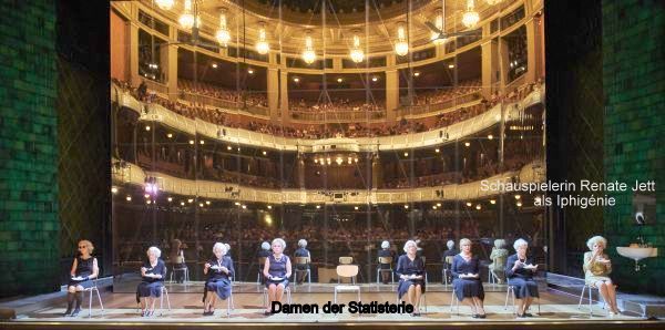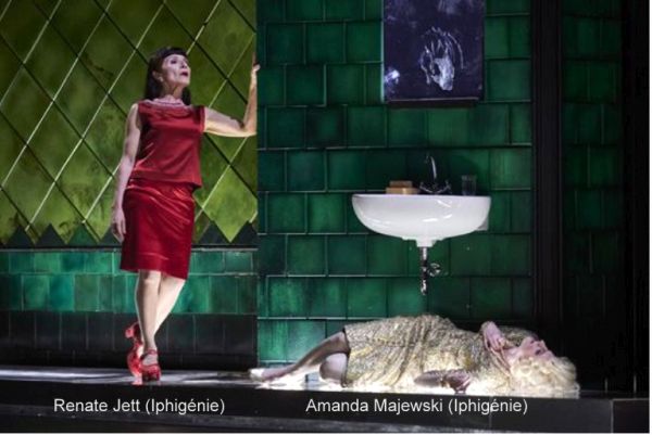 „Alte Damen, die den Tag im Morgenmantel verbringen. Ein Raum mit Betten, Tisch und Sessel, an der Wand eine Reihe von Waschbecken. – Es ist ein Altenheim, in dem diese Iphigénie an Tauride spielt….eine Figur sticht durch ihren goldenen Zweiteiler heraus: Iphigénie selbst, die antike Heldin. Immer wieder erinnert sie sich an ihre Jugend, daran, wie sie von ihrem Vater Agamemnon für den Krieg gegen Troja geopfert wurde.“ Am Ende des 2.Aktes – als Iphigénie die Trauerfeier für den vermeintlich toten Bruder begeht – sitzen die alten Damen vor der die Bühne ausfüllenden Spiegelwand, in der sich das Publikum selbst sieht, und verspeisen ungerührt ihren Nachmittagskuchen. Auch wenn sich der Bezug zu Glucks Musik nicht unbedingt erschließt – es ist zweifellos ein Bild, das sich in seiner kühlen Trostlosigkeit einprägt.
