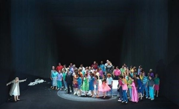 Hat sich dadurch aber etwas geändert? Zumindest hat es den Anschein – aber nur zuerst. In der am Anfang in grauen Einheitslook gekleideten Männergesellschaft haben auf einmal auch die Frauen etwas zu sagen. In dem Gralsritter haben sie einen Verteidiger ihrer Sehnsüchte und Wünsche gefunden, der der patriarchalischen Ausrichtung der Gesellschaft eine strikte Absage erteilt und auch das weibliche Geschlecht sich an der Politik beteiligen lässt. Als äußeres Zeichen dafür legen die Frauen bunte Kleider an und entledigen sich schließlich auch die Herren der Schöpfung ihrer grauen Gewänder. Die Männer sind zu Beginn des dritten Aufzuges ebenfalls unvermittelt in abwechslungsreiche farbige Outfits gewandet. Auf diese Art und Weise öffnet sich der Weg von der Anonymität des Kollektivs zu individueller Freiheit. Die Frauen erringen eine Kraft, wie sie auch Elsa aufweist. Mit ihr zusammen kreieren sie in der Münsterszene einen Fluss aus blaufarbenen Mänteln, der später mit leblosen Schwänen garniert wird. Mit diesem Einfall will der Regisseur laut Programmbuch ihre Fähigkeit ausdrücken, sich etwas vorzustellen, das die Realität transzendiert, in einer miserablen Lage nicht so sehr in den Traum zu fliehen als vielmehr dank ihm zu überleben.