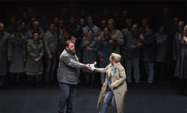 Der Zustand der Gesellschaft ist es, der Schilling in erster Linie interessiert. Kann sie sich halten oder muss sie am Ende zerbrechen? Jedenfalls benötigt die Gemeinschaft in hohem Maße eine Führungsperson, um zu erreichen, was sie sich vorgenommen hat. Und solchen Führungspersonen misstraut der aus Ungarn stammende Regisseur grundsätzlich. Dass er mit seinem Ansatzpunkt einen Seitenhieb auf Victor Orbán intendiert, ist nicht ausgeschlossen. Das Ganze ist eine äußerst pessimistische Angelegenheit. Regisseur und Bühnenbildner haben die Handlung in einen stets dunkel ausgeleuchteten, leeren und in einen Schlund mündenden Einheitsraum verlegt, der lediglich durch die Aktionen der Protagonisten definiert wird. Hier haben wir es also mit einem Theater der Reduktion auf der Ebene des Visuellen zu tun, in dem Brechts kaukasischem Kreidekreis, der zum Kampf zwischen Lohengrin und Telramund auf den Boden gezeichnet wird, zentrale Bedeutung zukommt. Árpád Schilling scheint Brecht in hohem Maße verbunden zu sein. Verfremdung ist angesagt, die ursprüngliche romantische Sage spielt keine wesentliche Rolle mehr. Essentiell sind, wie gesagt, kollektive Mechanismen, die nicht zuletzt durch die gelungenen Kostüme aufgezeigt werden.