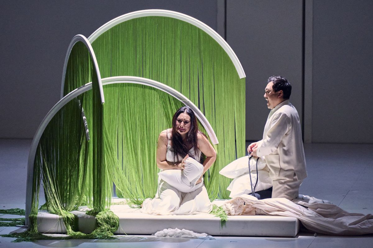Otello und Desdemona führen in dieser Produktion keine gute Ehe. Sie kommen an keiner Stelle richtig zusammen und bewegen sich fast immer in ausgemachter Distanz zueinander. Um hier die Wogen etwas zu glätten, hat ihnen die Regisseurin zwei Schattenfiguren zugeordnet, die die Gefühle von Otello und Desdemona ausleben und dabei häufig stark auf Tuchfühlung zueinander gehen. Sie tun damit genau das, was Frau Costa den Sänger-Figuren verwehrt. Zum Schluss sind diese beiden Gestalten ebenfalls präsent. Zuvor sterben Otello und Desdemona gleichsam einen symbolischen Tod. Sie legt sich ein riesiges Taschentuch aufs Haupt und verharrt im Folgenden still und bewegungslos an der Rampe. Dasselbe tut Otello, nachdem er zuvor drei Kopfkissen zu einem Paket zusammengeschnürt hat. Erst ganz am Ende bricht das glücklose Ehepaar dann tot zusammen, während sich die Schattenfiguren küssen. Das war ein sehr eindringliches Bild! Insgesamt kommen in dieser Inszenierung gefällige visuelle Impressionen nicht zu kurz. Einprägsam ist insbesondere der Augenblick, als Otello im zweiten Akt seinen Kopf auf Jagos Schenkel bettet und von diesem wie im Schlaf die Verleumdungen eingetrichtert bekommt. Im dritten Akt beginnt der sich wohl auf Kothurnen fortbewegende Jago auf einmal extrem zu wachsen. Erst am Ende des vierten Aktes erscheint er in seiner wahren Größe. Das Bild im zweiten Akt mit den Blumen sowie den unter Desdemonas ausladendem Umhang hervorkommenden Kindern weist indes eine leichte Spur von Kitsch auf.