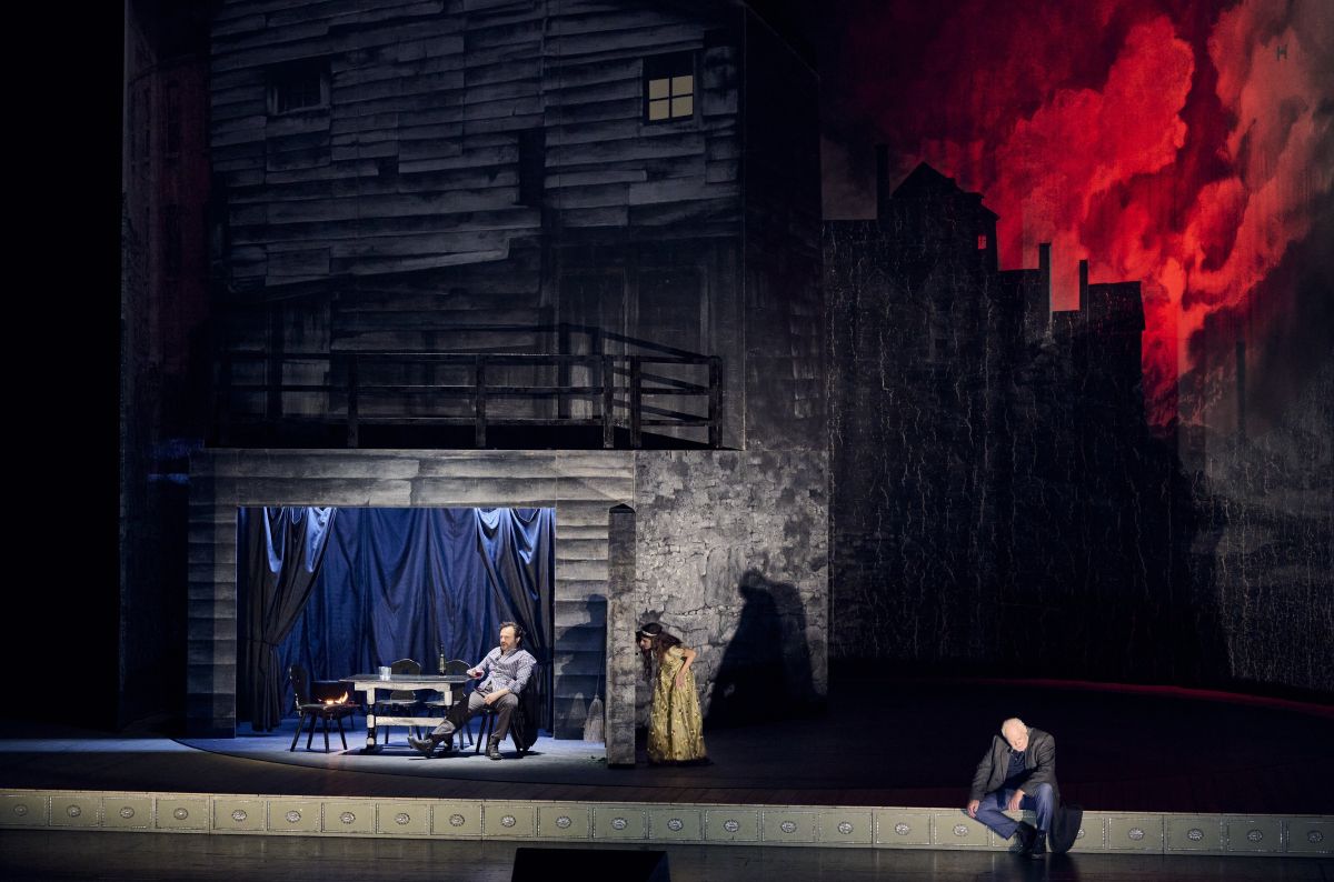 Wenn der Vorhang des Theaters auf dem Theater in die Höhe geht, sieht man eine von Bert Neumann errichtete, karg und düster anmutende Hinterhof-Fassade vor dem Prospekt einer maroden gräulichen Stadtansicht, die im dritten Akt von einem revolutionär wirkenden roten Feuerschein bedeckt wird. Die Revolution ist dann auch der Ausgangspunkt von Wielers und Morabitos Konzeption. Rigoletto, der hier noch den traditionellen Buckel trägt, ist ein begeisterter Anhänger der Französischen Revolution. Dass er sich in das Gefolge des Duca mischt, hat nur den einen Zweck, von dort aus den Aufstand in die Wege zu leiten. Sein ganzes Leben hat er der Revolution verschrieben. Strenggenommen ist es aber überhaupt nicht sein eigenes Dasein, das er lebt, sondern – gleich dem Prinzip des Theaters auf dem Theater – lediglich eine Rolle, in die er nur zu bereitwillig schlüpft. Als Agent provocateur hält er seine Umwelt ständig zu bösen Taten an. Damit verfolgt er das Ziel, das Terrorregime des verbrecherischen Duca von innen heraus zu vernichten. Nachhaltig ruft Rigoletto das Volk zur Revolution auf. Um das zu erreichen, macht er sich bewusst lächerlich. So schlüpft er zum Beispiel in denselben Königsmantel, den Napoleon auf Jacques Louis Davids bekanntem Gemälde von der Kaiserkrönung trägt. Solche Chiffren nützt das Regie-Duo gerne, zahlreich und gleichzeitig auch recht effektiv. Gleichzeitig lässt es nie einen Zweifel daran aufkommen, dass es sich hier um ein Spiel im Spiel handelt. Ein Beispiel für diesen Fakt ist, wenn der Bühnenraum mit Hilfe der Drehbühne um seine eigene Achse routiert und dabei die Rückseite der Aufbauten in ihrer Nüchternheit zur Schau stellt. Dieser Ansatzpunkt ist sehr verständlich. Schon William Shakespeare stellte das Postulat auf, dass die ganze Welt nur eine Bühne sei und alle Menschen in ihr nur Spieler wären. Damit sind die beiden Regisseure bei der Literatur angelangt, für die es ebenfalls große Sympathien zu hegen scheint.