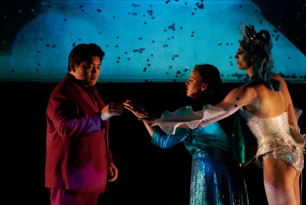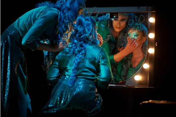 Überzeugend war der Ansatzpunkt des Regisseurs, die Oper in das Umfeld von Travestie und Drag zu verlegen. Diese Herangehensweise von Kraft hat sich im Lauf des gelungenen Abends glänzend bewährt. Diese Idee war nicht irgendwie willkürlich geartet, sondern resultierte aus Krafts Überlegung, dass sämtliche in dem Werk vorkommenden Wasserwesen bezüglich ihrer Geschlechtlichkeit außerhalb der Norm stehen. Aus diesem Grund nimmt er eine Zweiteilung der Partien von Rusalka, dem Wassermann, der Jezibaba und der Elfen vor. Er spaltet sie gekonnt in Sänger und Drag-Queens auf. Das ist ein vollauf gelungener Einfall. Das Gesangspersonal und die Travestie-Künstler sind dabei zunächst noch räumlich voneinander getrennt. Im ersten Akt gehört der untere Bereich der Bühne den Drag-Queens. Dominiert wird der Raum von einem 45 Grad nach vorne gekipptem Spiegel, der eine farbige Bodenfläche reflektiert und dabei den Eindruck aufkommen lässt, dass wir es hier mit einem kleinen See zu tun haben. Im oberen Bereich der Bühne befindet sich eine Brücke, auf dem die Sänger positioniert sind und singen. Zu den Worten der Sänger bewegen die Drag-Queens synchron die Lippen, so dass es so aussieht, als würden sowohl die Gesangssolisten als auch die Travestie-Künstler singen. Diese Märchengestalten werden bei Kraft zu schillernden Doppelwesen, die große Sinnlichkeit versprühen. Dieser Doppelgänger-Gedanke funktioniert hervorragend. Die Menschen dagegen werden nicht verdoppelt. Im Gegensatz zu den Drag-Queens stehen sie nicht zwischen den Geschlechtern. Sie sind und bleiben, was sie sind.
