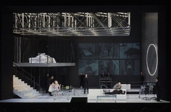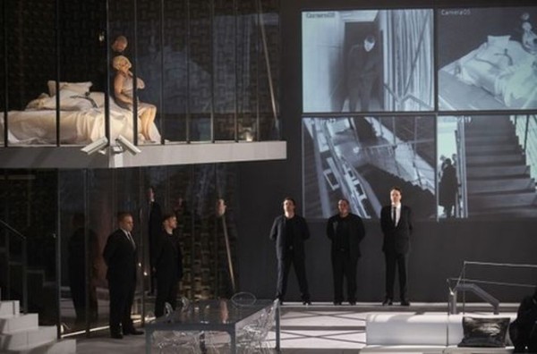 Darüber ist sich auch der in einem eleganten Anzug auftretende Herodes im Klaren. Sein herrschaftliches Anwesen hat er in einen Hochsicherheitstrakt verwandelt. Überall sind Überwachungskameras angebracht, die keinen Winkel der Villa unbeaufsichtigt lassen und den Gästen des Anwesens nachspionieren. Der Tetrarch und seine dekadenten Wohlstand pflegende Familie – zu seiner Ehefrau Herodias steht er in einer Beziehung bewussten Nichtverstehens – haben ständig Angst vor Anschlägen. Stets aufs Neue dringen über die Bildschirme aktuelle Schreckensnachrichten herein. Die Furcht vor dem IS ist nur zu berechtigt. Narraboth und der Page der Herodias sind Angehörige eines zeitgenössischen Sicherheitsdienstes, der alle Hände voll zu tun hat. Seine Aufgabe ist es, über Monitore die gesamte Villa zu überwachen. An der rechten Wand hängt ein riesiger Ring, der von den beteiligten Personen nur als Mond bezeichnet wird. Die als Bodyguards interpretierten Soldaten sind ebenfalls für die Sicherheit im Hause Herodes verantwortlich.