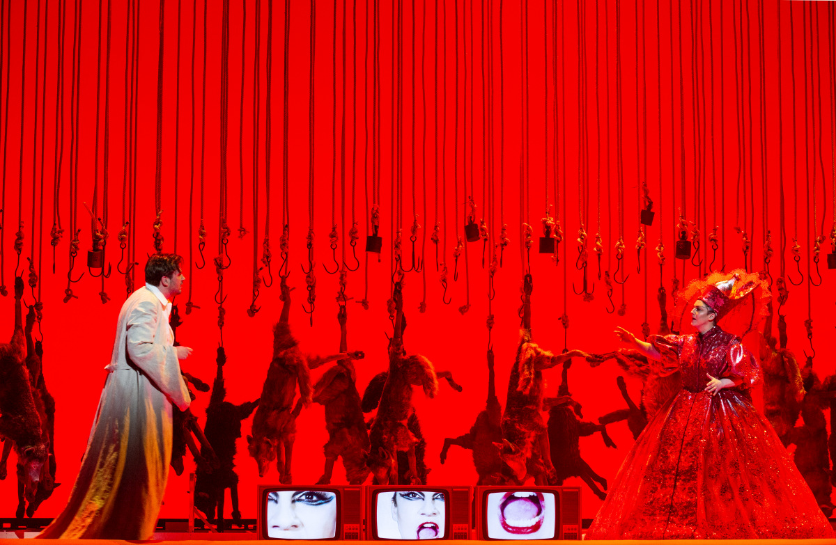 Die Säger sind durchweg erstklassig, angefangen mit dem Bariton Samuel Hasselhorn als Peter, der bereits in Die schweigsame Frau mit einer substanzreichen, farbigen, geschmeidigen Stimme erfreut hatte und zudem eine stattlich-gute Figur macht. Mit sattem, schillerndem, in allen Lagen einheitlich timbrierten Mezzosopran ist Katarina Bradiċ eine vorzügliche Mutter. Sunnyi Melles ist mit schonungslosem Einsatz ihrer Sprechstimme fast schon eine Karikatur von Azaël. Sophia Burgos kämpft als Clara mit feinem lyrischem Sopran um ihr Glück mit Peter, während Adriane Queiroz, wie der Chor in dicke (Wolfs?)pelzmäntel gehüllt, die Alte Frau eindrücklich sang. Im Kostüm, das gut einer Elisabetta in Donizettis Roberto Devereux gestanden hätte, geht Rosie Aldrigde als Anubis an ihre stimmlichen Grenzen. Otto Glass ist der tapfere Knabe zu Beginn und Schluss.