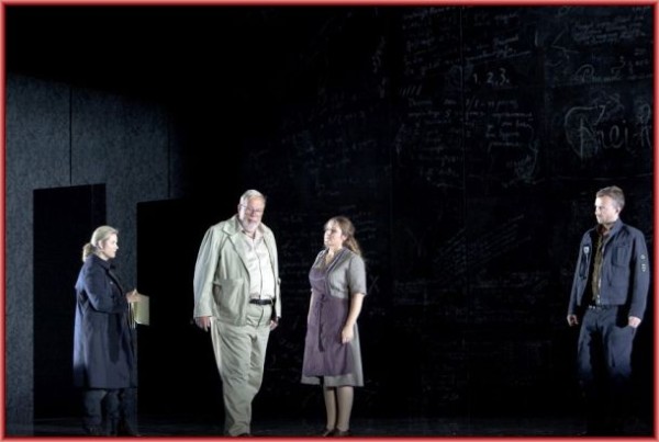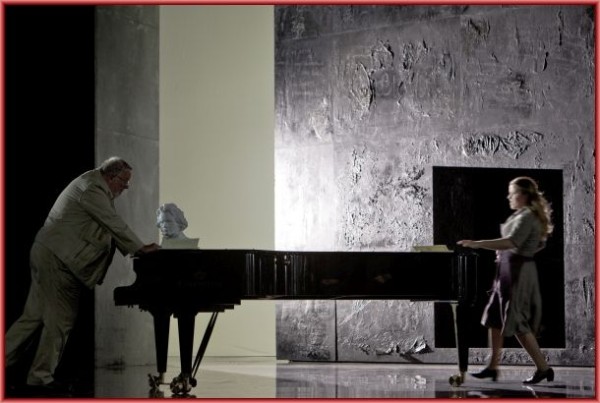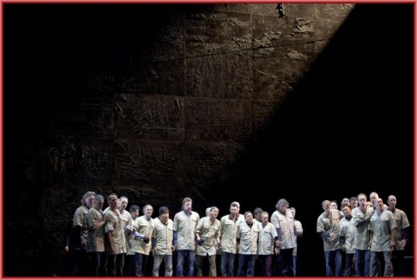 Begonnen wird in einer Probensituation mit dem gigantischen Prospekt des goldenen Saals des Wiener Musikvereins im Rücken, einem Flügel mit Beethovens Büste darauf im Zentrum der Bühne. Später wird dieser Flügel dann in den Hintergrund geschoben um im Schlussbild wieder seine zentrale Stellung einzunehmen. Wenn die Oper beginnt, fällt der Prospekt des Musikvereins zusammen und gibt den Blick frei auf eine gigantische schwarze Mauer. Darauf sind Inschriften zu erkennen, aber aus der Distanz nicht lesbar. Im Programmheft ist nachzulesen, dass sich der Bühnenbildner Hans Schavernoch von Inschriften inspirieren ließ, welche im Gefängnis der Gestapo-Zentrale in Köln entdeckt worden waren. Durchaus beeindruckend und bewegend, auch wenn man den tragischen Inhalt dieser Zeugnisse des Terrors als Zuschauer nur erahnen kann. Durch die stimmige Lichtgestaltung von Olaf Freese erhält diese drehbare Wand aber eine ungemein plastische Wirkung. Weniger Wirkung entfaltet allerdings Kupfers gut gemeintes Regiekonzept.