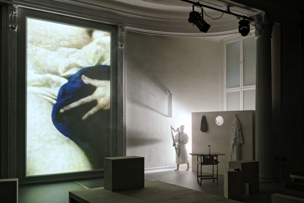 Eine öffentliche Garküche oder eine Klima-Demo hätte natürlich auch gut zu Scarlattis Liebes-Lamenti gepasst, aber man kann nicht alles haben. In einem solchen, d.h. Fitnessstudio, siedelt im alten Orchesterprobensaal der Staatsoper die Regisseurin, die zugleich für Video, oft verschwiemelt, und Kostüme verantwortlich ist, ihre Performance an; Matten, ein auf dem Boden liegender Schwebebalken, Seile, an denen auch mal eine schwarze Puppe in die Höhe gezogen wird, allerlei Podeste, Boxhandschuhe und Bademäntel gehören zur Ausstattung, und auf der Videowand fahren allesamt Fahrstuhl und sind dabei richtig fröhlich. Eine Beunruhigung des Besuchers über die Diskrepanz zwischen Kantatentexten und Visuellem kann nicht eintreten, denn die dankenswerterweise im Programmheft abgedruckten Texte kann man wegen vorherrschenden Dreivierteldunkels nicht lesen. Nebelschwaden, Schwarzlicht (?), rosafarbenes Lichtgewoge werden bemüht, ohne dass dem Zuschauer vermittelt werden kann, warum das so ist.