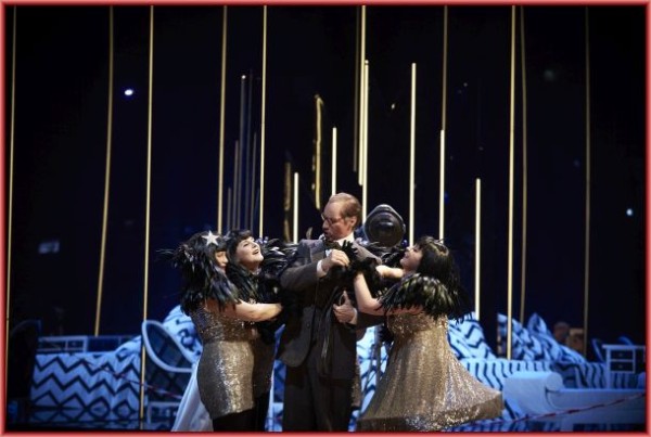 So fehlte es bereits dem Beginn an Duftigkeit, an Charme, an Eleganz, die die Musik hier auszeichnen, und das zusätzliche Orchesterspiel vor dem zweiten Akt war auch kein Gewinn für den Abend. Eine krasse Fehlbesetzung stellte der Lescaut von Roman Trekel, sonst ein hoch geschätzter Sänger dar, dem einfach Italianità und Farbe in der Stimme abging, dar. Auch der Geronte von Franz Hawlata war zu grau von Stimme und Gehabe her. Nie enttäuscht Stephan Rügamer, der einen wendigen Edmondo gab und etwas von der Atmosphäre des ersten Akt vermitteln konnte, für die auch der Chor hätte sorgen müssen, was jedoch zunächst nicht gelingen mochte. Einen warmen, runden Mezzo hatte Natalia Skrycka für den Musico, hier Anführerin einer albernen Girl-Truppe, die im Glitzerlook die Beine warf.