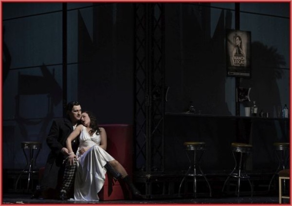 Was würde man wohl von einem Librettisten halten, der ein Liebespaar in einer Kutsche von Hollywood nach Paris fahren, eine Dame in der Erinnerung von leidenschaftlichen Küssen schwärmen lässt, die nie stattgefunden haben, weil Manon bereits am Schluss des ersten Akts in die Arme von Geronte sinkt, der in den Zwanzigern des 20. Jahrhunderts junge Mädchen deportieren, sie aber nur von A nach A bringen lässt, denn der Schauplatz bleibt mit dem Filmstudio (Bühne George Tsypin) stets derselbe. Eine neue Dreistigkeit ist es, die Inhaltsangabe – und das gleich doppelt- nicht libretto-, sondern regiegetreu im Programmheft wiederzugeben, was einige Verwirrung auslösen dürfte, da die deutsche Übersetzung buchstäblich als Übertitel läuft. Und was muss man von einem Regisseur halten, der immer noch nicht auf Trenchcoats und Fluchtgepäck, auf ins Publikum gerichtete Scheinwerfer, auf völlig unmotivierte papieraufwirbelnde Stürme und Regengüsse, außerdem noch unendlich viele Kussszenen aus alten Filmen über Videowände huschen, Des Grieux jedoch mit Fluppe und Kaffeebecher zum Wiedersehen mit Manon kommen lässt. So viel Jürgen Flimm sich auch an Überflüssigem und zum Werk Kontrastierenden einfallen lässt, so wenig kam ihm für die Personenregie in den Sinn, und wenn doch etwas, dann das Falsche. Welcher Regisseur lässt schon zu „Guardate“ eine rührende und damit ablenkende Szene mit verängstigten Kindern spielen, wer Schattenrisse unbestimmter Art zu „Oh tentatrice“ über die Leinwand (Robert Pflanz) wabern, verschenkt die Auftritte der Protagonisten, die dann auf einmal einfach „da“ sind?