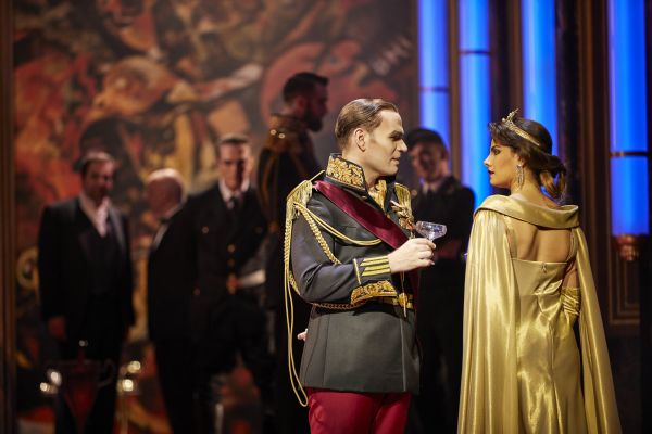 Vor dieses Dilemma sah sich anscheinend auch Bartlett Sher gestellt, als er sich daran machte, Verdis Rigoletto auf die Bühne der Berliner Staatsoper zu bringen. Da er sich wohl gerade in die Gemälde von George Grosz verguckt hatte, beschloss er, die Welt des Rigoletto, also die Renaissance, für „präfaschistisch“ zu erklären, diejenige, die die Kunst des Malers zeigt, als ebenso anzusehen, obwohl sie vorwiegend die Vertreter der alten Herrschaftsform und nicht der kommenden zeigt. Grosz malte Szenen des Berliner Lebens oder eines Teils davon, die Kostüme der Hofgesellschaft auf der Bühne zeigen viele schwarze Uniformen, die es in den Zwanzigern wohl in Italien gab, nicht aber in Berlin, und so werden die Grosz-Gemälde im Riesenformat, die den Zwischenvorhang und den Hintergrund des Duca-Palastes bilden, zur reinen Deko, ohne dass etwas vom Lebensgefühl der Weimarer Republik in die Inszenierung selbst eingeht. In der wird nämlich fröhlich an der Rampe gesungen, die Personenführung könnte konventioneller nicht sein, und wenn Gilda selbst Sparafucile die Mordwaffe reicht oder il Conte Ceprano seine Gattin ordentlich verprügelt, dann bringt das auch keine neuen Erkenntnisse über das Stück.