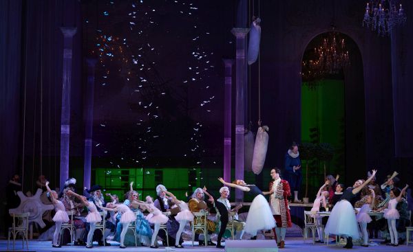 Jürgen Flimm zieht als Regisseur des Abends noch einmal alle Register seiner Kunst, treibt einen ungeheuren szenischen Aufwand, was sehr unterhaltsam, aber manchmal das musikalisch zarte Werk fast erschlagend wirkt. Zwar ist die Bühne schlicht gehalten, ein riesiger karg ausgestatteter Saal mit Ansätzen einer Bühne (George Tsypin), einiges, sich im Raum verlierendes Mobiliar, im Hintergrund ein Gemälde, ein Schiff im Sturm zeigend, das später durch das einer Landschaft ersetzt wird. Üppig wird es beim Personal, das nicht nur aus dem vom Libretto vorgesehenen besteht, sondern aus Scharen von Bühnenarbeitern, Ballettratten, Tänzerinnen, ja einem Wotan und Butterfly nebst Suzuki, die im Reigen mitmarschieren. Die sind samt und sonders in ständiger Bewegung, das Geschehen unterstreichend, konterkarierend oder einfach sich selbst genügend, Konfetti werfend, während es von oben Flaumfedern regnet. Höchst phantasievoll in Farben schwelgend ist die Lichtregie von Olaf Freese. Eine wahre Pracht sind die Kostüme von Ursula Kudrna, die in fröhlicher Unbekümmertheit den Zeitraum vom Barock bis zum Zweiten Kaiserreich umfassen, aber auch Gegenwartskleidung taucht ab und zu auf, vor allem beim musiklosen Vorspiel.
