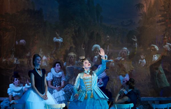 Die Dienerschaft mokiert sich über die Herrschaften und treibt allerlei Allotria. Nach der Pause scheinen alle beträchtlich gealtert zu sein, doch man probt immer noch, bis ein junger Sänger erscheint und vom Tod des Komponisten berichtet, der Sängerin das Fragment eines Musikstücks überlässt. Ein Streichquartett in historischen Kostümen sitzt auf der Seitenrampe, das eigentliche Orchester, da wo ein solches im Opernhaus hingehört.