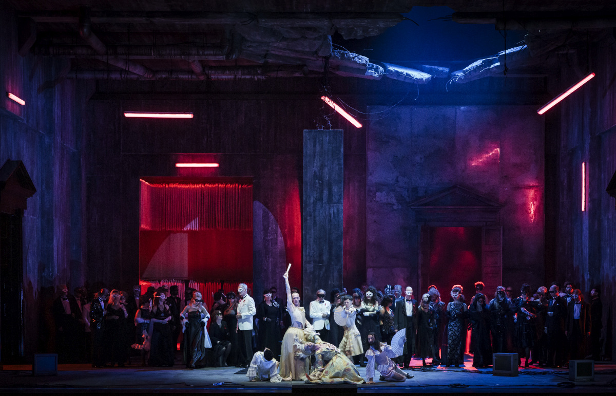 Die durchweg hässliche Bühne stammt von Emanuele Sinisi, die ebensolchen Kostüme hat Lorenzo Caprile zu verantworten, und von denen scheint es im Hintergrund bei Gouverneurs noch einige hundert auf Stangen und schön in Cellophan verpackt zu geben. Nicht viel mehr als uncharmantes Gehopse bringen auch die Tänzer auf dem Ball im vom Schreibtisch befreiten Arbeitszimmer Riccardos zustande (Choreographie Javier Pérez).