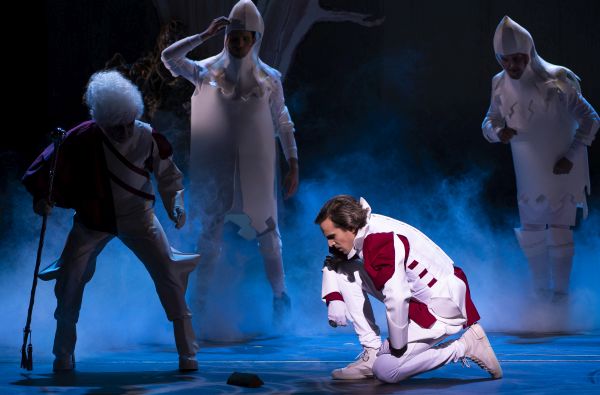Und ja, auch wenn ein echter Theaterzauber bei mir persönlich nur live vor Ort im Theater entstehen kann, so gelang es der Staatsoperette doch mit einer wirklich sehr gut gefilmten Produktion, mir in zwei unterhaltsamen Stunden einmal mehr klar zu machen, was einem derzeit bei den vielen geschlossenen Häusern alles fehlt. Die Inszenierung von Geertje Boeden ist in den ersten Minuten vielleicht etwas abstrakt, entfaltet dann aber durch eine stringente Umsetzung ihren ganz eigenen Charme mit ihrer grotesk überspitzten Darstellung der einzelnen Figuren. Dazu sind die Kostüme von Sarah Antonia Rung passend und mit vielen Details märchenhaft gestaltet. Die Ritter erinnern hierbei vielleicht etwas an Monty Phyton´s „Spamalot“, was aber wohl weniger an den Kostümen, sondern eher dem fingierten Ritt auf unsichtbaren Rössern liegen mag. Das Orchester der Staatsoperette liefert zudem unter der musikalischen Leitung von Christian Garbosnik einen durchaus vollen Klang ab, sofern dies am heimischen Fernseher aus den kleinen Lautsprechern überhaupt bewertet werden kann. Dazu sind auch der Chor und das Ballett des Hauses in die Produktion involviert, der man nur selten anmerkt unter welchen schwierigen Bedingungen diese Inszenierung umgesetzt werden muss. Natürlich sind Berührungen verboten und so muss Cinderella ihre Stiefschwester beispielsweise mit 2 Meter Abstand symbolisch trötend durchs Haar streicheln. Geschickt werden auch Handschuhe bei den Palastangestellten ins Kostüm integriert und Cinderella trägt im Hause der bösen Stiefmutter eine Art Haushaltshandschuhe, damit Requisiten problemlos übergeben werden können. Doch stopp, manch einer fragt sich nun vielleicht warum Cinderella ihre Stiefschwester überhaupt trösten muss, kommt dies im Märchen doch gar nicht vor. Die Antwort ist ganz einfach, denn das Musical hält sich etwas freier an die Cinderella-Story und mischt diese mit einer Prise Gesellschaftspolitik. So weiß der Prinz zum Beispiel gar nicht, wie sein Volk unter den Beschlüssen des Thronverwalters Sebastian leidet, die der Prinz stets mit vollem Vertrauen und ohne sie zu lesen unterzeichnet. Hiergegen will Jean-Michel, ein politischer Aktivist, vorgehen, der zudem unsterblich in Gabrielle, Cinderellas Stiefschwester, verliebt ist. Diese erwidert seine Liebe zwar, doch die Stiefmutter (hier genannt Madame) hat andere Pläne mit ihr, schließlich soll Gabrielle den Prinzen heiraten. Doch hier nimmt das Märchen dann wieder den bekannten Werdegang und der Prinz findet schließlich mit Hilfe eines gläsernen Schuhs seine wahre Traumfrau in Cinderella, nachdem man sich zuvor bereits mehrmals begegnet ist.
