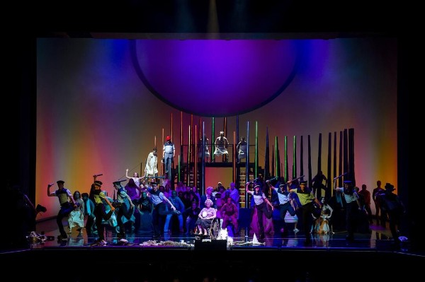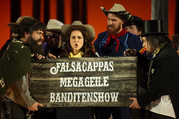Zunächst ist die Bühne in Dunst gehüllt. Das Räuberlager (alle Akteure, Chor und Ballett) formieren sich. „Wir fangen an“, ertönt es auf der Bühne, „Falsacappas megageile Banditenshow“, wie auf einer „Holz-“(Papp-)Kiste zu lesen ist, kann beginnen, und der Vorhang schließt sich zunächst – und wird wieder geöffnet. Man spielt „Theater auf dem Theater“ (hatten wir das nicht gerade bei Richard Wagners „Meistersingern von Nürnberg“ in der Semperoper?) – offenbar der neueste „Schrei“. Es scheint überhaupt bei dem, von der neuen Intendantin Kathrin Kondaurow engagierten, jungen Regisseur Valentin Schwarz und Bühnenbildner Andrea Cozzi nach fest(gefahren)en Regeln wie seinerzeit bei den Nürnberger Meistersingern zu gehen. Bei den Kostümen (Otto Krause) gibt es zwar (etwas) mehr als nur Kaufhaus-Look, aber eher in Richtung Indianer-Biwak bei den Karl-May-Festtagen im nahe gelegenen Radebeul.