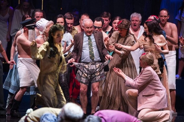 Das passabel und unter Andreas Schüller (seit 2013/2014 bis zum Ende dieser Spielzeit Chefdirigent) spritzig spielende Orchester der Staatsoperette, das wenigstens Offenbachs unsterblicher Musik zu ihrem Recht verhilft und dafür am Ende eindeutig und mit Abstand den meisten Applaus erhält, wird hochgefahren und später wieder abgesenkt. Man kann zeigen, dass auch diese Technik im neuen Haus funktioniert, und das war sogar ein neuer Gag!