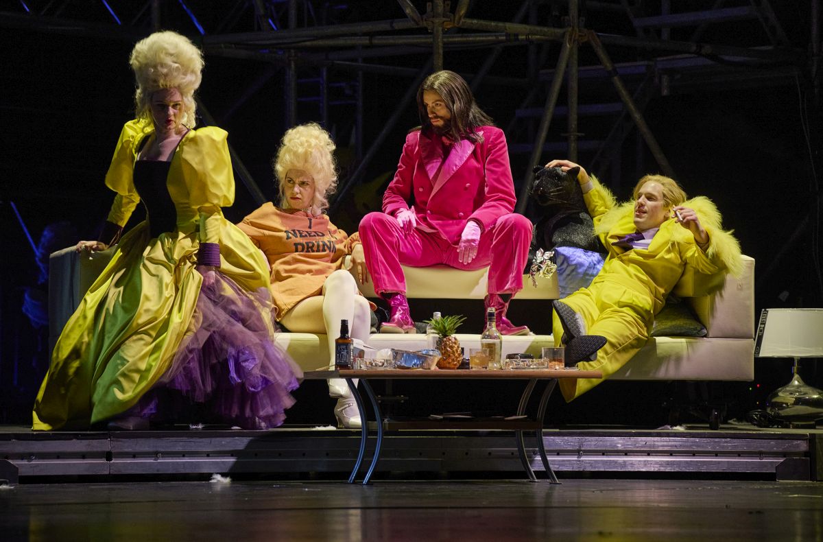 Es fing damit an, dass zur ausgesprochen spritzig servierten Ouvertüre ein volltrunkener Mann mit merkwürdigem, knallgelbem Maskenumhang an die Rampe wankte und dort liegen blieb; das war, wie sich später herausstellte, der als Fledermaus verkleidete Dr. Falke, der vom Chor in einheitlicher Alltagskleidung (Kostüme: Agathe MacQueen) gnadenlos ausgelacht wurde. Etwa gleichzeitig sah man geschmacklose Video-Clips in TikTok-Manier (Video: Franziska Junge), in denen u.a. sich erbrechende Figuren zu sehen waren.