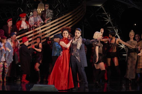 Am Staatstheater hatte man die neue „Witwe“ dem von Film und Fernsehen bekannten Schauspieler und Regisseur Klaus Christian Schreiber anvertraut, der eigens eine moderne Dialogfassung erstellte, die aber dem Affen stellenweise zu viel klamottigen Zucker gab und verknappt eher mehr Effekt gemacht hätte. Das glich die sehr lebhafte, geschickte Personenführung weitgehend aus. Die zeitlose Thematik des Stückes – Geld regiert die Welt und Gefühle bleiben oft auf der Strecke – wurde durch Handys und Ausdrücke aus der Jugendsprache betont, wie auch durch moderne Kostüme der Protagonisten, die allerdings beim Chor sehr skurril und plunderig wirkten (Ausstattung: Madeleine Boyd). Alle Spielorte waren mit Verwendung weniger, typisierender Versatzstücke unter dem Eiffelturm angesiedelt, eine gute Idee. Das gab Raum für die wunderbaren Tanzeinlagen des speziell zusammengestellten Ballettensembles, die von nun an fester, oft folkloristischer Bestandteil der Operetten wurden (Choreographie: Amy Share-Kissiov).