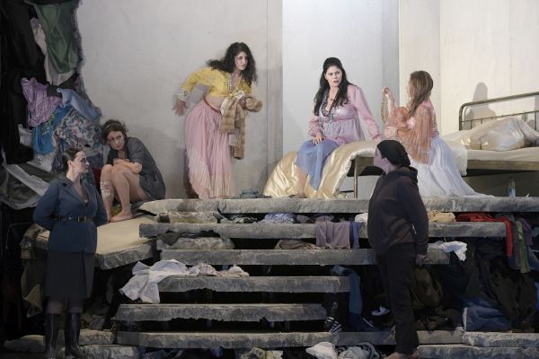 Regisseurin Adriana Altaras hat versucht, hauptsächlich das Innenleben der drei Frauen psychoanalytisch zu deuten, wozu die links vorn am Bühnenrand stehende braune Liege à la Freud im Grunde überflüssig war. Denn ihre jederzeit gut nachvollziehbare Führung vor allem der drei Protagonistinnen, jede für sich ganz starke Darstellerinnen, brauchte solche Äußerlichkeiten nicht. Auch einzelne Aktualisierungen wie das Outfit des Orest als Kriegsreporter oder sein Pfleger als angeblich Blinder, der im Finale in einem Buch liest, waren für die aus sich heraus verständliche Handlung nicht nötig. Diese läuft ab in einem von hohen Mauern begrenzten Raum (Ausstattung: Christoph Schubiger), der zu Beginn wie auch in der Schlussszene von einem riesigen Kleiderhaufen beherrscht wird, was natürlich an die aufgehäuften Gebrauchsgegenstände in den KZs erinnert, zumal im Laufe des Abends immer wieder Kleidung hinzugefügt wird. Die dreigeteilte Drehbühne zeigt auch das Schlafzimmer von Chrysothemis, das mit einer ganzen Reihe von Brautkleidern dekoriert ist – Zeichen dafür, dass Elektras Schwester die grausige Vergangenheit durch Flucht in eine möglichst kinderreiche Ehe verdrängen will. Im Inneren des Kleiderbergs befindet sich Klytämnestras Schlafzimmer, in dem sie sich in ihren Albträumen auf seidener Bettwäsche wälzt und das am Ende blutbesudelt ist. Der Schluss ist hier deshalb ungewöhnlich, weil Elektra ihre Befreiung nicht im Tod findet, sondern zum aus dem Orchestergraben herauf klingenden ekstatischen Tanz ihre bisher getragene männliche Kleidung ablegt und mit offenen Haaren im körperbetonten Kleid die Bühne wie befreit verlässt, während Orest unter seinen Taten schier zusammenbricht.