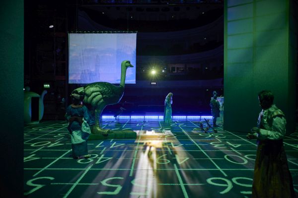 In der Braunschweiger Inszenierung, die dritte nach der Uraufführung überhaupt, (Regie: Isabel Ostermann ) gibt es 64 durchnummerierte Felder wie auf einem Schachbrett; wer wo, wann und wie lange auf einem der bis zum vorderen Bühnenrand reichenden Felder steht, ist ebenfalls der Bestimmung durch den Computer vorbehalten. Die Bühne wurde mit Fotos von typischen Bühnenbildern aus bekannten Opern, auch aus Braunschweiger Inszenierungen, und Partitur-Titelblättern bestückt. Den Bühnentechnikern, die sonst für das Publikum unsichtbar wirken, konnte man nun zusehen, wie sie u.a. große Komponisten-Porträts, Möbelstücke, eine Giraffe und einen großen Straußenvogel auf der Bühne hin und her schoben. Den Ensemble-Mitgliedern wurden entsprechend ihrem Stimmfach farbenfrohe, liebevoll gestaltete typische Kostüme und Requisiten zugeteilt (Ausstattung: