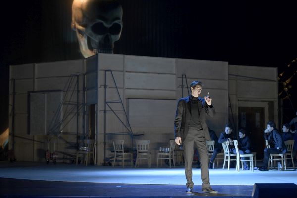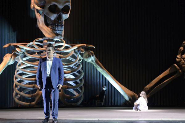 Aber eins nach dem anderen und zunächst zur Inszenierung von Markus Bothe: Sie begann etwas befremdlich, nämlich nicht in Fausts Studierzimmer, sondern im Sterbezimmer eines Krankenhauses, wo Faust den Tod sucht. Statt in den „Pokal der Ahnen“, wie es in den Obertiteln stand, träufelte er eine tödliche Überdosis in einen blauen Plastikbecher. Nun drang Mephisto gleich mit fünf teuflischen Handlangern, wie er in schwarze Anzüge gekleidet, ins Krankenzimmer ein. Im Folgenden wurden die Handlungsorte mit fahrbaren Kulissenteilen angedeutet, so dass immer deutlich blieb, dass wir im Theater waren (Bühne: Robert Schweer): Kneipe, Gretchens sparsames Zimmer, später der karge Altarraum einer Kirche, und schließlich der Gipfel der Fantasielosigkeit: Zu einem nach der Walpurgisnacht furios vom Staatsorchester dargebotenen Stück aus der sonst kaum noch in den „Faust“-Inszenierungen vorkommenden Ballettmusik wurden die Kulissenteile von der Bühne gefahren, bis sich die übrig gebliebenen Akteure einsam auf der langsam kreisenden Drehbühne bewegten, auf die ein überdimensionaler Totenkopf mit Brustkorb-Skelett blickt („Rigoletto“ aus Bregenz lässt grüßen!) – letzteres nun doch ein durchaus beeindruckendes Bild.