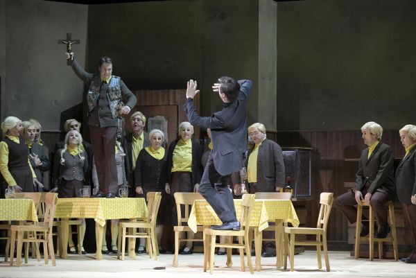 Außerdem waren nach dem Konzept des Inszenierungsteams die Choristen durch irgendwie zeitlose, uniformierte Kleidung, Augenmasken und blonde Perücken (Kostüme: Justina Klimczyk) sowie gleichgeschaltete Bewegungen durchgehend eine anonyme Masse, die wie Marionetten den geheimen Anweisungen Mephistos zu folgen hatte. So mussten sie zu Mephistos „Lied vom goldenen Kalb“ in krampfartige Zuckungen verfallen und sich zur zweiten Strophe heftig prügeln. Einzig Valentin, Siebel und Marthe lösten sich aus dieser Masse, indem sie ihre Maske samt Perücke ablegen durften – so recht verständlich war das alles nicht.