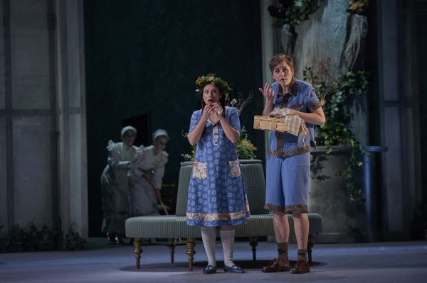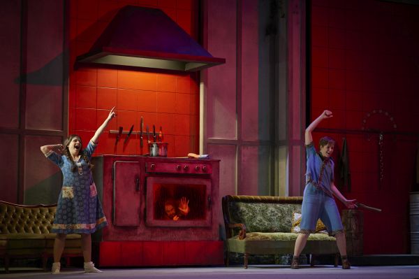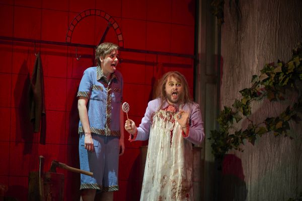 In der wenig stimmungsvollen Inszenierung von Brigitte Fassbaender gibt es erfreulicher Weise keine psychologische Überfrachtung, sondern das Märchen bleibt, was es ist. Dennoch ist manches gewöhnungsbedürftig: So gibt es statt des sonst alles beherrschenden Waldes ein ziemlich heruntergekommenes Hotel, in dessen Foyer sich all das abspielt, was eigentlich die Atmosphäre des Waldes braucht (Ausstattung: Bettina Munzer). Nur in den Ouvertüre und Verwandlungsmusik begleitenden Schwarz-Weiß-Videos (Grigory Shklyar) gibt es Wald, wo Kinder mit Gepäck wie bei der Landverschickung mit der Harzer Schmalspurbahn in das genannte Hotel namens „Ilsenstein“ gebracht werden (tatsächlich existiert bei Ilsenburg im Harz ein „Am Ilsestein“, allerdings in deutlich modernerem Zuschnitt als das Bühnenmodell). Das verwunschene Hotel findet sich wieder als Bild in der schlichten Wohnung des Besenbinders Peter. Dort schickt die frustrierte Mutter die Kinder in den Wald, Erdbeeren sammeln. Diese landen im „Hotel Ilsenstein“, wo an der Rezeption ein greisenhaftes Kind beschäftigt ist, das sich später als Sandmännchen herausstellt, das den Kindern den Sand aus einem Salzstreuer in die Augen pustet (Moritz Gildner mit dezent verstärktem, ansprechend sauberem Knabensopran). Auch die Hexe ist schon da, eine bärtige Dame, die sich am nächsten Tag in eine Horror-Figur mit schmierigen Zottelhaaren, blutiger Schlachterschürze und Hackebeil verwandelt.