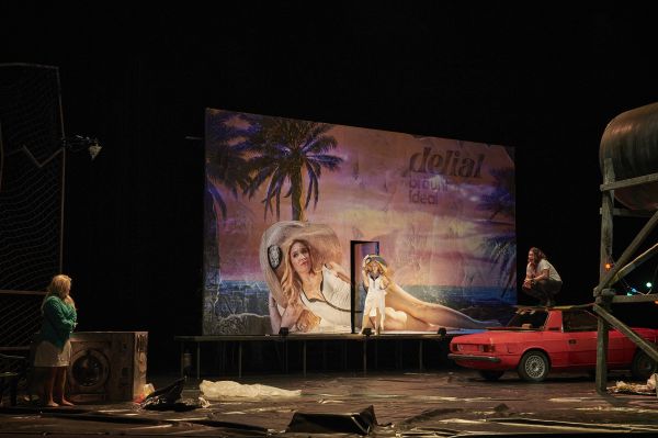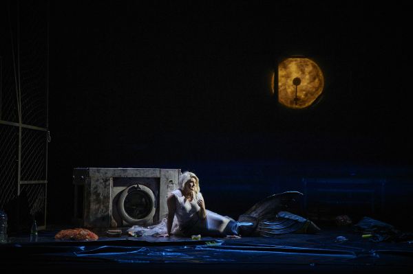 Der sonore und zugleich flexibel geführte Bass von Jisang Ryu passt bestens zum besorgten Wassermann. Die fremde Fürstin ist in der Neuinszenierung eine ansehnliche Strandschönheit aus einer großen Delial-Werbestellwand, die Ekaterina Kudryavtseva mit ihrem deutlich stärker ins schwerere Fach weisenden Sopran ausfüllt. Edna Prochnik gibt die mysteriöse Hexe Jezibaba mit höhensicherem, dramatischen Mezzo und ausgeprägter Bühnenpräsenz. Was die Figuren des Hegers (Maximilian Krummen mit wohlklingendem Bariton) und des Küchenjungen (prägnant und gewohnt kultiviert Milda Tubelytė) eigentlich treiben, wird nicht so ganz deutlich; mir kamen sie wie lustlose Arbeiter der städtischen Müllabfuhr vor, die an den Rändern des ausgetrockneten Teichs Müll einsammeln müssen. Die drei Elfen, die eher lustvoll im Müll herumwühlen, sind Jelena Banković, Isabel Stüber Malagamba und Zhenyi Hou, deren klare Stimmen bestens aufeinander abgestimmt sind.