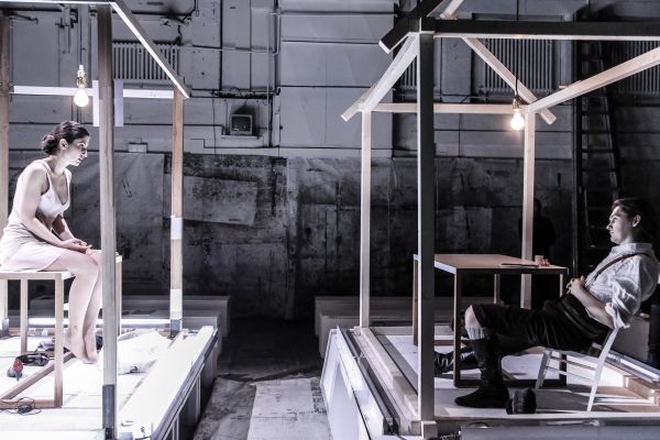 Braunschweigs Operndirektorin Isabel Ostermann hatte bereits 2014 an der Berliner Staatsoper die beiden Stücke herausgebracht und nun mit wenigen Veränderungen an ihrer neuen Wirkungsstätte vorgestellt. Auf der kahlen Spielfläche im Kleinen Haus befanden sich zwei karge, durch Holzbalken angedeutete Räume, in denen die beiden Personen nicht etwa nacheinander, sondern abwechselnd agierten (Ausstattung: Stephan von Wedel). Die so wichtigen Texte wurden in der jeweiligen Originalsprache gesungen; die beiden Monitore mit den deutschen Obertiteln waren allerdings ungünstig angebracht, sodass sie für das Publikum nur teilweise sichtbar waren. Musikalisch sind beide Werke ineinander verschränkt, sodass der musikalische Leiter Christopher Lichtenstein am Klavier zwischen beiden Partituren hin und her springen und auch einige Orchester-Passagen der Poulenc-Oper vom Band abspielen musste. Das alles meisterte der junge Kapellmeister glänzend. Dadurch, dass das Publikum ganz nah um die Spielfläche herum saß, entstand eine eindringliche, unmittelbar packende Atmosphäre.