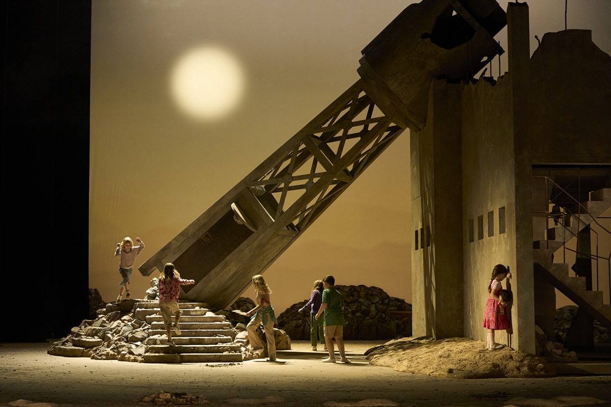 „Solange man sich zurückerinnern kann, herrscht Krieg mit den Nachbarn“, heißt es in der Einleitung im Programmheft. Und dieser Konflikt spielt sich nicht unter Pyramiden ab, denn frei von jeglichem Ägypten-Kitsch zeigt die aus Israel stammende Regisseurin, wohin religiöser Fanatismus, Besitzdenken und Rachelust führen. Auf der von ihr und Bettina John gestalteten Drehbühne steht ein zerstörtes Haus, wie wir es aus den Bildern aktueller Nachrichtensendungen kennen, ein umgestürzter Turm, Haufen von Schutt, auf denen Kinder spielen – und zeigt damit, da das die Seite der Sieger ist, dass der Krieg nur Verlierer hervorbringt. Zu ihnen gehört auch Radames, den Naamat nicht als strahlenden Kriegshelden präsentiert, sondern als tief traumatisiert von den Kämpfen, welche sie im Triumphmarsch als beklemmende Rückblende zeigt. Sinnfällig steckt Bettina John den Pharao, den die einen um Rache, die anderen um Gnade anflehen, in ein Richtergewand. Die Priester werden zu Kämpfern: Die Religion ist zum Anhängsel der Armee verkommen. Die Liebe der Kriegsgefangenen Aida und des Soldaten Radames wird in diesem Krieg aufgerieben, hat von Beginn an keine Hoffnung auf ein Happy End.