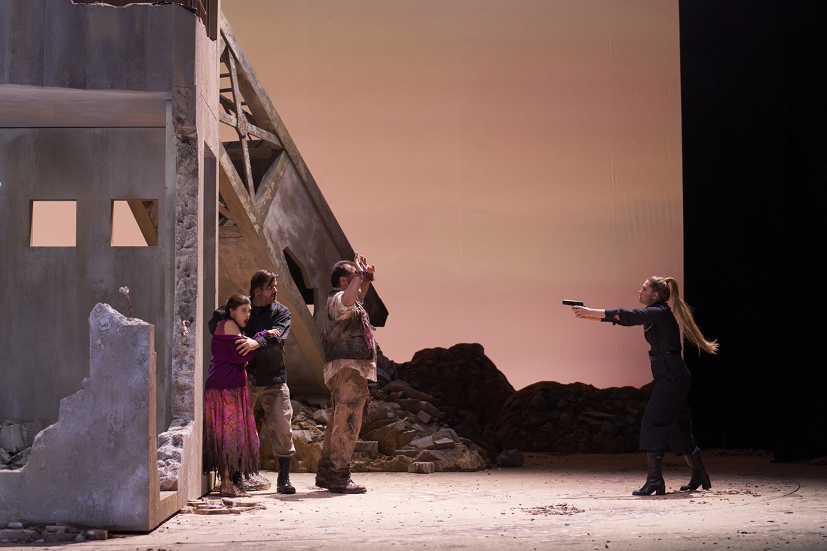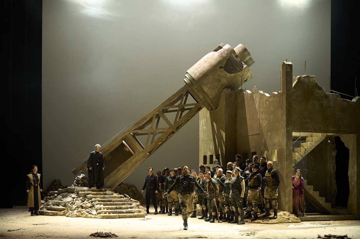 Noa Naamat wählt teils so drastische Bilder, dass sich das Theater zu entsprechenden Warnungen beim Betreten des Hauses gezwungen fühlt, spielt Bomben- und Kampfeslärm ein, und auch wenn ihrer Regie in der zweiten Hälfte des Abends ein wenig der Sogcharakter der ersten abhandenkommt, gelingt ihr gerade in der offen zur Schau gestellten Brutalität ein eindrücklicher Friedensapell: Amneris kritzelt im letzten Bild „Pace“ (Frieden) an die zerbombte Häuserwand, hinter der Aida und Radames sterben werden.
