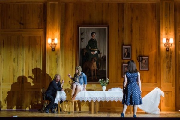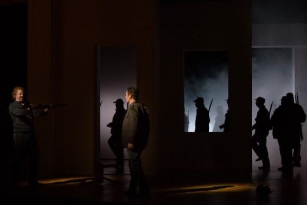 Martin Baumgartner, der auch für die Videos verantwortlich zeigte, eine stimmungsvolle Atmosphärenmusik komponiert. Dieses Vorgehen der Regisseurin macht durchaus Sinn, gegen das Stück wird trotz einiger von der Vorlage abweichenden Änderungen nicht verstoßen. Max ist in der Deutung von Eva-Maria Höckmayr ein Kriegsheimkehrer – womöglich aus Afghanistan -, der schon in der Vergangenheit schwere Schuld auf sich geladen hat. Worin diese besteht, erweist sich in der Wolfschlucht: Er hat einige unschuldige Soldaten erschossen. Diese Szene hat mit der traditionellen Schauerromantik nichts mehr gemeinsam, sondern entspringt voll und ganz dem Inneren Agathes. Ihr ist bereits zu Beginn, als man sich an der riesigen Familientafel trifft, klar, dass ihre Liebe zu Max gefährdet ist und versucht diese zu retten. Sie versteht seine Handlungsweise nicht und will dieser auf einer inneren Reise in die Wolfsschlucht auf den Grund gehen. Diese hat, wie gesagt, nichts Reales, sondern ist als Blick in die Abgründe der menschlichen Psyche aufzufassen – eine treffliche, an Sigmund Freud angelehnte Deutung.