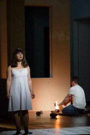 Von großer Eindringlichkeit war schon die Eingangsszene aus der bereits vergangenen Juni aus der Taufe gehobenen Neuproduktion von Webers „Freischütz“ am Staatstheater Darmstadt: Agathe packt ihre sieben Sachen, zieht ihr Brautkleid aus und verlässt die Bühne. Der am Rand stehende Max kann nichts dagegen machen. Das hier nicht glückliche Ende wird vorweggenommen. Das Folgende erzählt Eva Maria Höckmayr als Rückblende. Im Focus steht das Geschehen zwischen dem Polterabend des Paares und dem verhängnisvollen Probeschuss. Dabei folgen die Regisseurin und ihre Bühnen- und Kostümbildnerin Julia Rösler nicht etwa althergebrachten Aufführungskonventionen, sondern entwickeln eine ganz eigene Sichtweise auf das Werk.