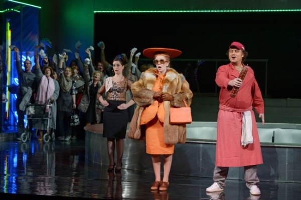 Der Regisseur Axel Richter verlegt den fiktiven deutschen Duodez-Stadt, das Großherzogtum Gerolstein, in eine ganz konkrete Umgebung: die Plaza eines Einkaufszentrums mit Brunnen und Glastüren an einer Seite sowie aufgestapelter Ausverkaufsware (natürlich Schuhe, einem derzeit besonders beliebten Requisit der Regie) auf der anderen Seite. (Bühne und Kostüme fantasievoll: Klaus Noack). Ein etwa zwanzigköpfiger Chor in modern-verrückten Kostümen bevölkert die Szene: „Kunden und Beschäftigte der Shopping Mall“ sind das und natürlich gleichzeitig Statisten. Aus denen schälen sich zwei der Hauptdarsteller heraus: Wanda und Fritz, Reinigungskräfte. Mit einem kleinen Laufband werden Getränke und Snacks bereitgestellt. Das weitere Hauptpersonal der Operette wird nach und nach vorgestellt: zunächst General Bumm in dunklem Anzug, gefolgt von Baron Pück, dem ebenso dümmlichen wie wichtigtuerischen Politberater de Großherzogin. Die tritt erst als letzte auf – begleitet von eine pelztragenden Entourage – und mischt sich plötzlich in die Staatsgeschäfte ein. Den stieseligen Prinzen Paul mit seinem Brautwerber Baron Grog lässt sie links liegen. Denn sie verliebt sich in den dialekt-sprechenden Fritz, den sie im Rang sogar über den kommandierenden General Bumm erhebt und in irgendeinen Krieg schickt. Um gegen feindliche Einwirkungen gesichert zu sein, zieht man sich im Einkaufszentrum Schuss-sichere Westen an; das Lungervolk kommt nach der Pause in Camouflage-Anzugteilen in die Mall zurück, in die auch Fritz wieder siegreich einzieht. Seine Wanda will ihn aber nicht an die Großherzogin abtreten, was zu den letzten Verwicklungen führt.