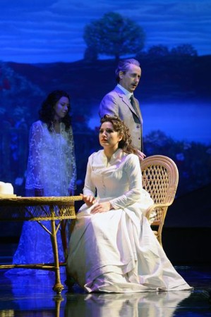 Im Übrigen bewegte sich Dews Deutung indes stark in traditionellen Bahnen. Zwar hat er den Zigeunerinnenchor im zweiten Akt kurzerhand in eine vergnügliche Variéteeinlage umgedeutet, aber eine Schwalbe macht ja bekanntlich noch keinen Sommer. Dew degradiert Verdis Oper größtenteils zum reinen Ausstattungsstück, woran auch der manchmal recht kammerspielartige Charakter seiner Personenführung nichts zu ändern vermag. Er lässt das Ganze in einem Fin- de-siècle-Ambiente spielen. Dementsprechend fast überbetont pompös muten die von José-Manuel Váquez geschaffenen Kostüme insbesondere der Damen an, die einer stringenten Führung des Chores wohl etwas im Wege standen. Hier wäre weniger mehr gewesen. Und die bieder wirkende Landschaftsidylle impressionistischer Prägung mit See und Wiesen, die im zweiten Akt den Hintergrund von Traviatas Landhaus dominiert, ist ein rechter Blickfänger, der etwas von den Personen ablenkt. Da war im Schlussakt der Paris zeigende Hintergrundprospekt schon stimmiger. Wenn dieser und das Naturbild des zweiten Aktes bei Violettas Tod gleichsam ineinanderfließen, wird der Spagat zwischen den diametral entgegengesetzten Lebenswelten Violettas als Prostituierte und als Landfrau noch einmal recht sinnfällig ausgedrückt. Obwohl Dews Inszenierung schon einige durchaus ansprechende Aspekte aufwies, klebte er insgesamt doch zu sehr am Libretto und verweigerte sich einer tiefer schürfenden Aktualisierung des Stoffes.