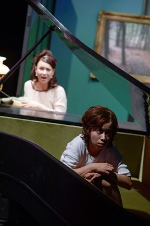Ein Problem der Kammerspiele ist die wenig befriedigende Akustik, mit der die Instrumentalisten zwar leidlich zurecht kamen, die sich auf der vokalen Ebene aber nicht sonderlich vorteilhaft auswirkte. In dieser Hinsicht dürfte weiter auch der Fakt, dass bei den Kammerspielen die Zuschauertribüne nahtlos in den Bühnenraum übergeht, eine Rolle spielen. Die schon oft bewährte Susanne Serfling, die in den vergangenen Jahren eine gute stimmtechnische Entwicklung durchgemacht hat, beeindruckte als Gouvernante mit guter Fokussierung und geradliniger Führung ihres jugendlich-dramatischen Soprans sowie einfühlsam-beherztem Spiel. Allerdings wurde insbesondere bei den ausladenden vokalen Höhenflügen deutlich, dass ihre Stimme für die Kammerspiele schon etwas zu groß ist. In Nichts nach stand ihr Anja Vincken, die mit kräftigem, ebenfalls bestens sitzendem und ausdrucksstarkem Sopran die Miss Jessel recht unheimlich sang. Tiefsinniges, tadelloses Mezzomaterial brachte Elisabeth Auerbach für die Mrs. Grose mit. Schon von ihrer sehr kleinen, zierlichen Statur her war die äußerlich stark an die Schauspielerin Sabine Menne erinnernde Aki Hashimoto eine Idealbesetzung für den Miles. Auch vokal wurde sie mit ihrem vorbildlich italienisch fundierten Sopran ihrer Rolle voll gerecht. Neben ihr fiel die relativ dünn singende Flora von Samantha Gaul ab. Auch der stark im Hals intonierende Lasse Penttinen als Prolog und Quint täte gut daran, seinen Tenor in den Körper zu bekommen. Gesungen wurde in Darmstadt eine von Constanze Backes erstellte, nicht gerade gelungene neue deutsche Textfassung. Dass die Oper nicht in der englischen Originalsprache gegeben wurde, stellte in stilistischer Hinsicht ein erhebliches Manko dar. Ein derartiges Abweichen von der ursprünglichen Diktion des Werkes hatte sich bereits bei der Coburger Produktion des Stückes in der vergangenen Spielzeit negativ ausgewirkt. Auf der anderen Seite hat das Darmstädter Ensemble in den durchweg vorzüglichen Coburger Sängern so im Notfall potentielle Einspringer zur Verfügung.