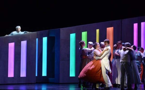 Alban Berg: Dew lässt die ersten Szenen auf der nackten Bühne spielen. Spärliches Mobiliar wie ein Friseursessel mit kleinem Konsoltischchen oder gerade nur ein Stuhl (für Maries Wohnung), werden mit dem Hebewerk auf die Bühnenfläche gebracht. Dafür hat der Zuschauer einen Blick auf die grandiosen Beleuchtungsbrücken, die eindrucksvoll bewegt werden. Dann kommt aber als Kontrastprogramm eine Arztpraxis mit einem bühnenbreiten Vitrinenschrank und allerhand Ausstellungsmaterial heraufgefahren: Der Doktor hängt, bevor er sich mit Wozzeck über Schöpsenfleisch und Bohnen unterhält, seinen Mantel an einem Skelett auf. Auch zur Volksfestszene wird ein opulentes Bühnenbild präsentiert; das geht ganz hinten auf der riesigen Bühne auf, wo auch die Bühnenmusik platziert ist. John Dew präsentiert in der vorletzten Szene seine gesamte luxuriöse Untermaschinerie, mit deren vielfach abgeteilten Hebebühnen die Wellen des Sees imaginiert werden, in welchem Wozzeck ertrinkt. In dieser zweiten Oper wiederholt die Regie keine einzige Szene, keine einzige Bewegung aus der ersten. Aber es gibt doch eine Verklammerung der beiden Stücken in den überaus gelungenen, aussagestarken funktionalen Kostümen von José-Manuel Vázquez, der die gleichen Rollen sehr ähnlich und farblich jeweils gleich einkleidet; für das Gurlitt-Stück in schlichtem Biedermeier-Stil, für die Berg-Oper in der Mode um 100 Jahre in die zwanziger Jahre verschoben. Abgesehen von den beiden Ausstattungsschmankerln führt auch bei der Berg-Oper die starke Reduktion der Bilder zu einer eindrücklichen Konzentration auf die beiden Hauptfiguren Wozzeck und Marie und die schlaglichtartige Beleuchtung ihres Umfelds. Eine starke Inszenierung!