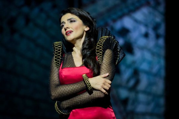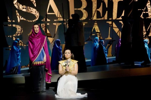 Am Stadttheater Gießen stellt nun Intendantin und Regisseurin Cathérine Miville diese Oper zum ersten Mal außerhalb von Spanien als deutsche Erstaufführung vor. Im Sinne des Alhambrismus könnte man das Stück in historisierend prächtiger Szenographie mit Löwenhof präsentieren: Architektur, Kostüme, Aufmärsche. Aber einmal ist das auf der kleinen Gießener Bühne gar nicht so einfach, und die Geschmacksrichtung von heute würde da auch nicht mehr treffen. So steuert Frau Miville mit ihrem Ausstatter Lukas Noll einen Mittelweg. Der stellt eine halb-abstrakte modern kubistische gestaltete und vielfach gegliederte Stahlkonstruktion auf die Drehbühne, wobei sich die einzelnen Spielorte nur wenig konkret präsentieren, aber durch die Drehungen der Bühne immer gut abgehoben werden können. In eine große Blechwand sind die Namen der Reyes Católicos, Fernando und Isabella gestanzt; davor, dahinter und darunter präsentieren sich Protagonisten und Chöre in modern stilisierten Kostümen. Den Bühnenabschluss bilden (in frühbarocker Technik) stehende, drehbare dreikantige Prismen, die von innen beleuchtet sind und orientalisierende Muster zeigen. Von der Alhambra bleibt auf der Bühnenrampe lediglich ein bemaltes Sperrholzmodell in Form eines Throns übrig, auf den sich Isabella besitzergreifend und provozierend zu Beginn der Oper setzt. Während der Text mit heute als diskriminierend empfundenen Ausdrücken (die Luft „stinkt“ vor Moslems) angereichert ist, werden in der szenischen Darstellung Vorurteile gegen die Muslims natürlich nicht Text-entsprechend instrumentalisiert, keine Pluderhosen oder Fese für die orientalischen Truppen, aber doch genügend deutliche Hinweise auf die Zugehörigkeit zu den Parteien von Einzelpersonen und Chor, der sich mehrere Male umziehen muss. So wird die Handlung leicht verständlich erzählt. Großes Mitempfinden für die eine oder andere Person mag sich handlungsbedingt nicht einzustellen, aber dafür sorgt dann die Musik.