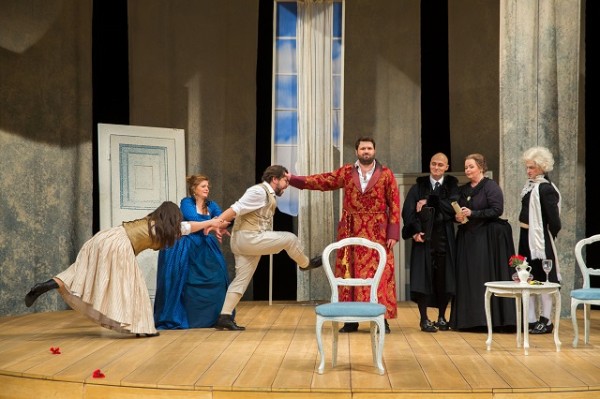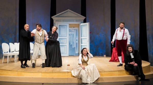 Das von Heiko Mönnich dafür erdachte Bühnenbild präsentiert als Spielfläche eine Holzscheibe, auf der es nur weniger Requisiten bedarf, um mit einem enorm spielfreudigen Ensemble ein turbulentes Treiben zu entwickeln, welches das Publikum ohne Leerlauf über drei Stunden auf das Beste unterhält. Die ebenfalls von Mönnich entworfenen Kostümen orientieren sich an Vorbildern der Mozart-Zeit. Das wirkt erfrischend nach all den Aktualisierungen der vergangenen Jahre, bei denen Darsteller in modernen Straßenanzügen in Designer-Wohnzimmern etwas herbeizwingen mußten, was Opernkritiker mit intellektueller Attitüde gerne „brennende Aktualität“ nennen.