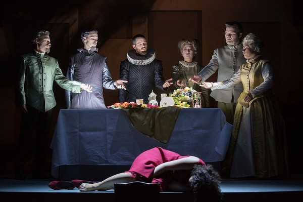 Giordanos Musik ist ein buntes, packendes und bewegendes Konglomerat aus Tänzen und neapolitanischen Kanzonen vollen Lokalkolorit, bewegenden Vorspielen und Instrumentalpassagen und atmosphärisch dichten Klangbögen, die zeitweise voller Schroffheit und instrumentaler Wucht nur so strotzen, um – ganz nach der veristischen Maxime – die Gefühle der Protagonisten auf der Bühne auch wahrhaftig hörbar zu machen. In Gießen nun, hat man dieser intensiven, aus dem vollen schöpfenden Musik den zarten, schlanken Klang von Madrigalen aus der Feder von Carlo Gesualdo gestellt und so mit einem musikalischen Gegenpol gearbeitet. Das Solistenensemble, das Gesualdo singt, steckt in herrlichen Renaissance-Kostümen von Claudia Krull und tritt wie aus einem Setzkasten heraus auf das ansonsten schlichte Bühnenrund von Lars Peter. Regisseur Wolfgang Hofmann hatte die geniale Idee, die Madrigalsänger als Zeremonienmeister der Erfüllung des Gelübdes zu inszenieren, die historisch gewandeten Sängerinnen und Sänger führen die Protagonisten der Giordano’schen Oper, legen Ihnen Requisiten in die Hand und leiten sie zu Handlungen an. Die genau austarierte Personenführung schafft eine zusätzliche Spannungsebene, so dass die Madrigale nicht nur als Füllmaterial für eine zu kurze Oper erscheinen, sondern eine neue Dimension eröffnen.