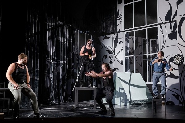 Mit Benjamin Brittens Rape of Lucretia setzt das Gießener Stadttheater seinem Publikum anspruchsvolle Kost zum Saisonstart vor. Man merkt es zu Beginn, daß das Publikum mit den spröden, schroffen Klangfarben der ersten Szene fremdelt. In einem Feldlager besaufen sich Offiziere und machen derbe Späße über die Tugendhaftigkeit der zu Hause gebliebenen Ehefrauen. Bühnen- und Kostümbildner Lukas Noll hat dafür das Setting von der Antike in die Gegenwart verlegt. Die Soldaten tragen moderne Kampfanzüge. Das Ganze findet im Innern eines geschlossenen Raumes statt, in dem aber ein Zelt aufgebaut ist. Ein wenig wirkt es wie ein Spiel von groß gewordenen Kindern, die im Wohnzimmer ein Feldlager nachstellen.
