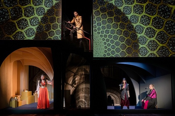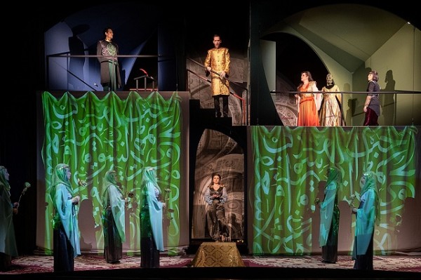 Die Regie von Dominik Wilgenbus widersteht der Versuchung, den Konflikt von Islam und Christentum und die Verortung des Geschehens im Nahen Osten zur Ausrede für politische Stellungnahmen, Aktualisierungen oder Überschreibungen zu nutzen. Sie unternimmt nichts weiter, als die vorgesehene Handlung plausibel zu arrangieren. Das ist bei unbekannten Stücken für das Publikum hilfreich. Die szenischen Möglichkeiten steckt das Bühnenbild von Lukas Noll ab mit vier neben- und übereinander gestellten kleinen Räumen nach Art eines Setzkastens. Das ermöglicht fließende Szenenwechsel und Parallelaktionen. Christliches und Muslimisches ist teils baulich etwa mit einem angedeuteten Kreuzrippengewölbe, überwiegend aber mit Projektionen jeweils typischer Architektur und Symbole präsent. Die ebenfalls von Noll entworfenen Kostüme mischen phantasievoll, aber dezent historische Kleidungsstile mit aktualisierender Ausführung. Die Männer tragen moderne Anzughosen, welche aber bei den Muslimen mit orientalisierten, mitunter verzierten Gehröcken, dazu Turbanen und bei den christlichen Kreuzrittern mit Andeutungen von Rüstungen mittels Schulteraufsätzen kombiniert werden. Die Damen werden als Angehörige des Harems in Schleier gekleidet wie aus einem Bilderbuch zu Tausendundeine Nacht.