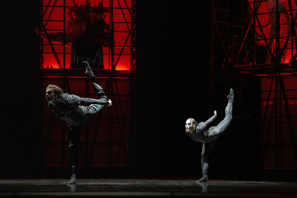 Von den Protagonisten ist zunächst Jay Aries als Rotbart zu nennen, der den Jugendlichen in seiner Entwicklung zum Erwachsenen mit teils ruppigen, teils eleganten, jedoch stets kraftvoll sicheren Bewegungen glaubhaft vermittelte. Der einem echten Pas de deux vergleichbare Tanz mit dem Weißen Schwan (intensiv Antoine Charbonneau) wird zu einem Höhepunkt des 1.Aktes. Im 2.Akt älter geworden, schien er dagegen zu erkennen, dass er dem Bösen zu stark zuneigte und seine Wehr- und Willenskraft ließ zusehends ab. Sehr spannend war nun der Kampf mit dem Schwarzen Schwan (hervorragend Alina Uzunova). Seine fast ständigen Begleiter, die zwei Narren, wurden von Nicolás Alcázar Sánchez und Edward Nunes quirlig munter dargeboten. Im Übrigen bestach das gesamte Tanzensemble durch Präzision und äußerste Beweglichkeit. Es begeisterte, wie die „Schwärme“ aus Schwänen sich in Windeseile aufbauten, zerfielen und neu formierten. Es wurde mehr dem Boden verhaftet, ausdrucksstark in Mimik und Gestik getanzt, wenn auch die geballten Fäuste etwas zu häufig kamen.