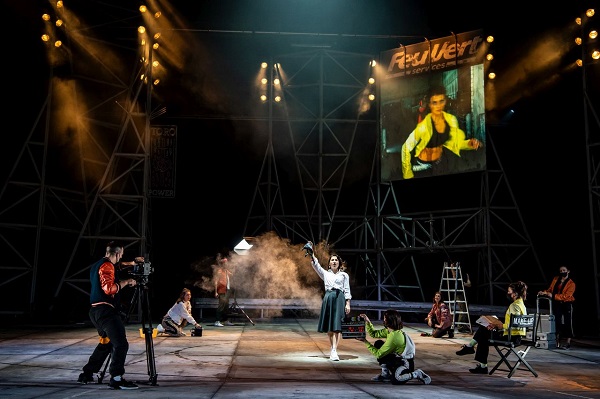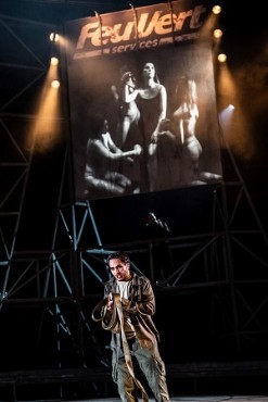 Hier geht es mit den sich dort herumtreibenden jungen Leuten, gesellschaftlichen Underdogs, hoch her. Sergio Verde sorgt auf einer hochgestellten Leinwand ähnlich wie Frank Castorf das Geschehen mitzufilmen und zusätzliche Szenen einzublenden. Die ominösen Kameraleute, eine sich mittlerweile immer mehr abnutzende postmoderne Stereotype des Regietheaters, huschen also auch wieder mal störend durch das Geschehen. Ganz amüsant war aber der Einfall, dass Carmen einmal vor dem eingeblendeten Werbe-Stier des spanischen 30-prozentigen Brandys Osborne singen darf, wenigstens noch ein wenn auch kommerzieller Anflug von einem allerdings auch schon etwas klischeehaften Spanien-Kolorit.