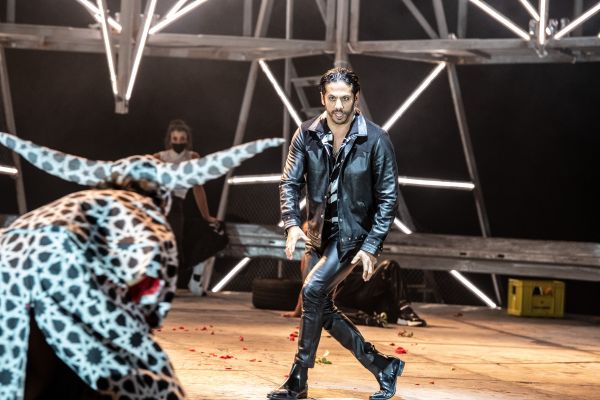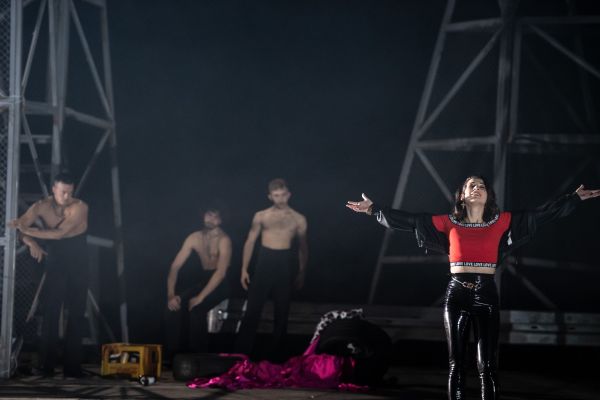 Das Einheitsbühnenbild von Thilo Ullrich war ein von Stahlaufbauten umgebenes, teilweise von einer Leitplanke begrenztes Rund, das eine Art Arena suggerierte. Hier in einer der trostlosen Vorstädte Sevillas lungerten in moderner, fantasiereicher Kleidung (Eva-Maria Van Acker) ein paar junge Erwachsene herum. Dabei fiel negativ auf, dass die Regisseurin einen fast durchgehenden, nicht immer einsichtigen Aktionismus dieser Jugendlichen betreiben ließ, der vom Kern der Handlung zumindest teilweise ablenkte. So tobten sie z.B. mit dreirädrigen Gefährten mit Stierköpfen, mit Motorrädern und immer wieder mit Autoreifen und Getränkekisten herum, die sie von rechts nach links und umgekehrt platzierten; oder während der „Habanera“ wurde eine Filmszene gedreht (warum?).