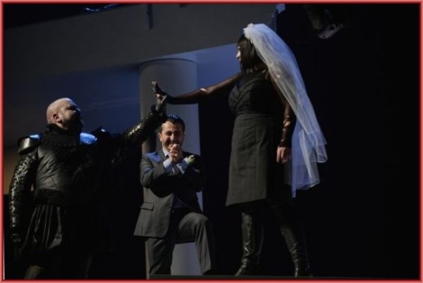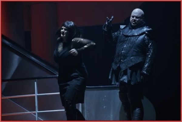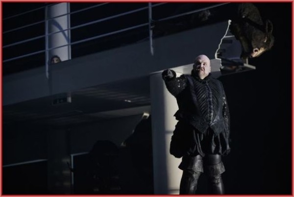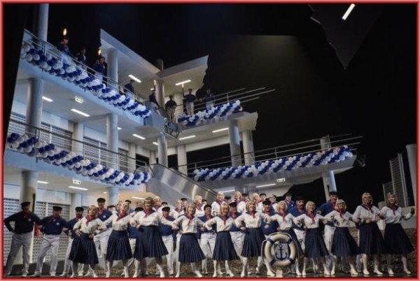 Im 2.Akt sieht man natürlich keine Spinnräder, sondern die mit blonden Einheitsfrisuren versehenen Chordamen in Pelzen und mit Designer-Einkaufstaschen kommen offenbar gerade von einer ausgiebigen Shopping-Tour zurück (aha: Konsumkritik!). Mary (stimmlich ungewohnt unterbelichtet Julie-Marie Sundal) bemüht sich um Senta, die wegen ihrer Aufmachung der Gothic-Szene zuzurechnen ist. Zwischen dem Holländer und Senta entwickelt sich im folgenden Duett keinerlei Zuneigung; vielmehr geht bei Senta die pubertäre Schwärmerei fürs Dunkle weiter, indem sie die zuvor bei der Piratenpuppe stehenden Lichter jetzt um den Holländer drapiert. Im 3.Akt gibt es uniformierte Matrosen und passend dazu gekleidete Frauen en masse; Chor und Extrachor treten nun tänzerisch gekonnt (Choreographie: Anastasiya Bobrykova) wie in einer Musik-Show auf. Aus dem Tiefgeschoss mischt sich die Holländer-Mannschaft ein, bis eine brennende Fackel hinein geworfen wird. Konsequent begeben sich der Holländer und ihm folgend auch Senta die Treppe herunter – ob es eine Erlösung gibt, bleibt optisch und musikalisch offen, denn das Erlösungsmotiv erklingt nicht.