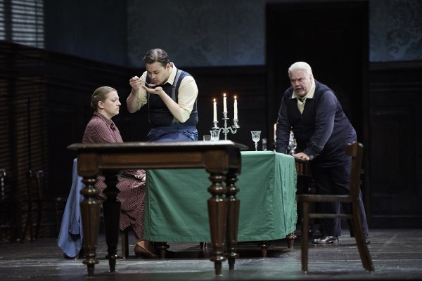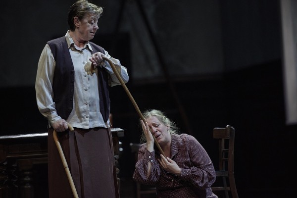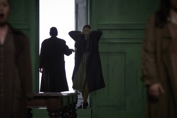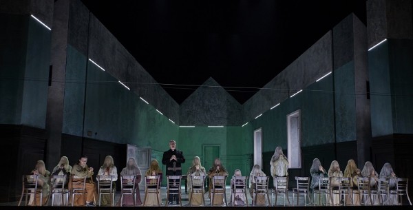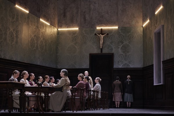 Das Ganze Werk atmet also aufgrund der historischen Verflochtenheit und der musikalischen Umsetzung durch Francis Poulenc Katholizismus. Und gerade den versucht Hilsdorf in seiner Interpretation des Stoffes in den Hintergrund zu drängen. Er zeigt Blanche und die übrigen Karmelitinnen nicht als im Ordenshabit zur Einheit verdammten Religionsgemeinschaft, sondern schon rein optisch als Individuen, die allesamt Alltagskleidung aus der Entstehungszeit des Werkes tragen, die Renate Schmitzer entworfen hat. Der sich nach hinten verengende Bühnenraum ist Blanches Zuhause, zuerst bei ihrem Vater, später im Karmel – und doch alles andere als heimelig, ein allzu kitschiger Madonnenparavent schafft Intimität in den Szenen der alten Priorin. Zwischen den Tablaus schließt sich immer wieder eine Häuserzeile, die die Abgeschlossenheit der Welt verdeutlicht, in die sich die Frauen zurückgezogen haben – die imposante Bühne stammt von Dieter Richter – denn sie alle sind in ihren eigenen, ebenfalls individuellen Zwängen gefangen und suchen ihr Heil in der Religiosität. Doch damit ist keineswegs das Seelenheil gemeint, nicht die spirituelle Erlösung ist das Ziel der Konventsmitglieder, sondern das Loswerden des eigenen Zwangs durch Fokussierung auf das Gebet. Mittels ausgeklügelter Personenführung und kleiner und kleinster Gesten zeichnet Hilsdorf präzise Charakterbilder der einzelnen Protagonisten und ihrer vielschichtigen Beziehungen untereinander und schon im Laufe der Aufführung überzeiht den Zuschauer mehrfach ein Schauer.