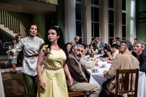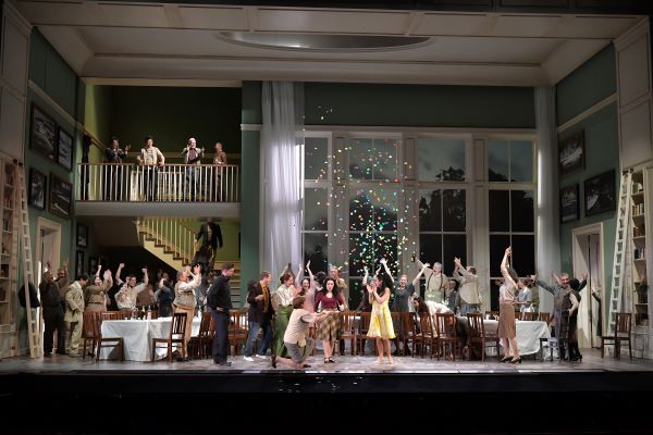 Bekanntlich beruhen Tschaikowskis „Lyrische Szenen“ auf Alexander Puschkins gleichnamigem Vers-Roman, mit dem es in Hannover gleich beginnt: Auf Russisch rezitiert eine Sprecherin Puschkin, wie die Freundschaft von Lenski und Eugen Onegin entstanden ist, während die beiden auf dem Fußboden des großen Saals in Larinas Landguts rumalbern, offenbar kiffen und sich langsam verziehen, wenn die Akteure der ersten Szene erscheinen – ein überflüssiger Einstieg, denn man weiß, dass die beiden eine enge Freundschaft verbindet. Wie diese entstanden ist und dass sie trotz großer Verschiedenheit Bestand hat, ist für den Ablauf der Handlung letztlich uninteressant. Alles findet in einem Einheitsbühnenbild (Susanne Gschwender) mit einer übergroßen Fensterwand statt, durch die man in eine parkähnliche Landschaft und zuletzt auf Hochhausschluchten von St. Petersburg blickt. Durch die passenden Kostüme von Eva Butzkies wird deutlich, dass die Hausregisseurin Barbora Horáková die Handlung aus der Mitte des 19. Jahrhunderts in die Gegenwart geholt hat, ohne dass dies irgendwie plausibel ist. Denn so manche Klimmzüge sind nötig, um die Handlung aus früheren Zeiten dennoch glaubwürdig zu gestalten, wie beispielsweise beim Duell, das zu einer tödlich endenden Rauferei mit versehentlich ausgelösten Schuss wird. Sonst bleibt die detailverliebte Regisseurin erfreulicherweise eng an der Vorlage, wobei es einige Merkwürdigkeiten gibt, die nicht immer verständlich sind: Da lehnt sich Tatjana bei ihrer ersten Begegnung an die Brust Onegins, was sich das schüchterne Mädchen nie trauen würde; dass bei emotionalen Aufwallungen ständig Stühle umgeworfen werden oder dass man sich häufig auf den großen Tisch begeben muss (Olga tanzend, Tatjana den Brief schreibend), sind wohl gern gewählte Regieeinfälle, die allerdings nicht immer überzeugen. Wenn Tatjana sich am Schluss der Briefszene Wasser aus der Blumenvase über den Kopf schüttet und Onegin sich beim Übergang von der Duell-Szene zum Fest bei Gremin während der Polonaise zum Gejohle auf offener Bühne umziehen muss und später nach dem Wiedersehen mit Tatjana in ein auf die Bühne gefahrenes Terrarium klettert, um sich dort mit Erde zu beschmieren – da hört das Verständnis auf. Ansonsten waren besonders die beiden Feste von einer teilweise übertrieben wirbeligen Turbulenz, wie sie selten zu erleben ist.